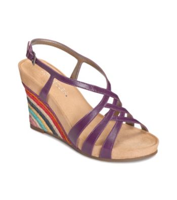 Sandals. A colorful heel and fabulous design make these sandals spectacular! A pair of Aerosoles "Lemon Plush" Casual Sandals will add some fun to your summer time wardrobe. The rainbow colored wrapped wedge heel provides an eye catching detail while criss-crossing straps up the foot create a slimming silhouette. Featuring all the comfort you expect from Aerosoles, these beautiful casual sandals are a must have for your shoe collection. Featured in purple 3.75" heel 0.75" platform Rubber sole Imported