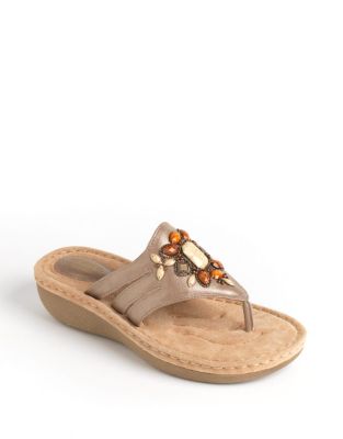 Superior craftsmanship and materials set this thong sandal apart Full grain leather upper with beaded detailing Hidden elastic side gores allow easy walking Leather-wrapped latex footbed Thick rubber-like wedge sole for substantial cushioning1-1/2" heel height